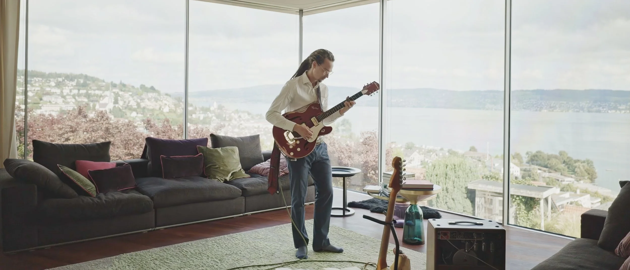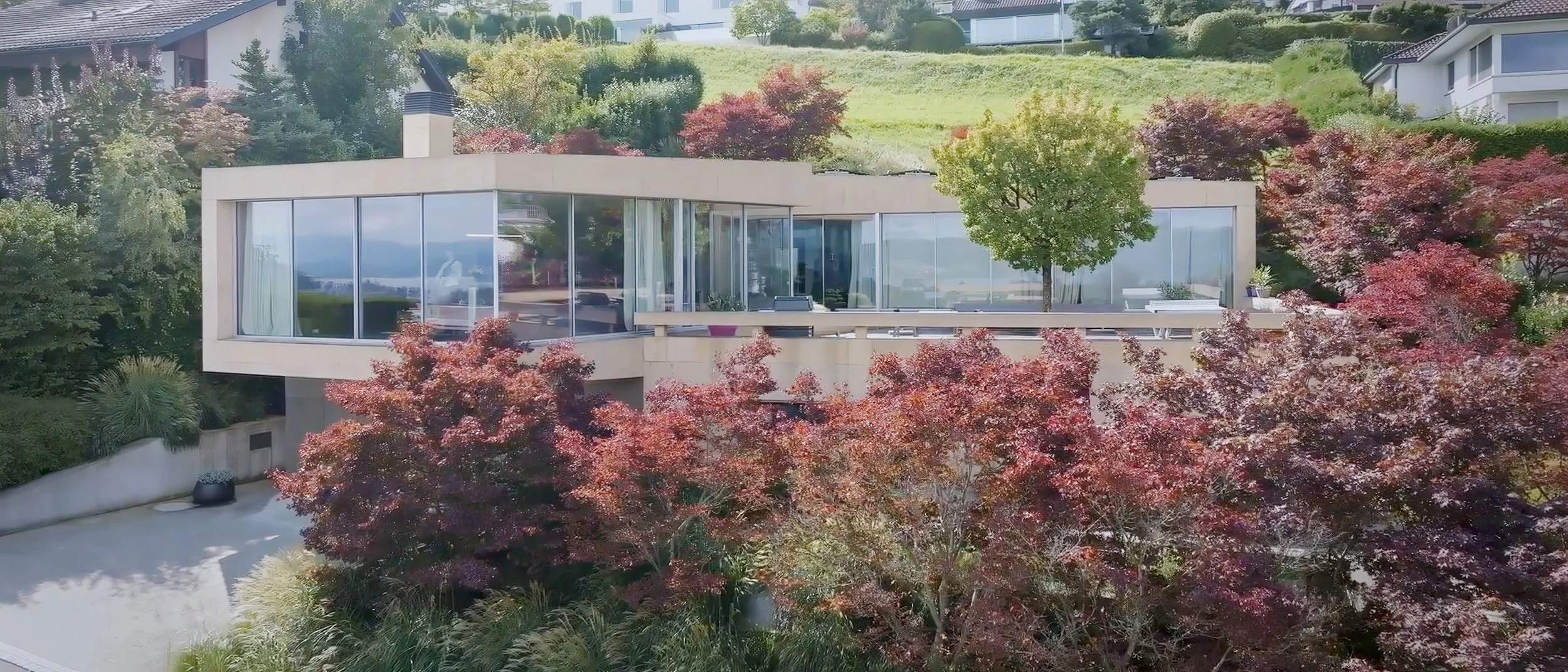 The villa on Lake Zurich, designed by the Basel-based architecture team Kunz & Mösch, stands out with its striking architecture and meticulously planned spatial composition. Like a dam wall, the structure cuts deep into the steep moraine slope, creating a powerful presence while also conveying a sense of shelter and security. A large window front offers residents a spectacular panoramic view of Lake Zurich, placing it at the heart of the living concept.